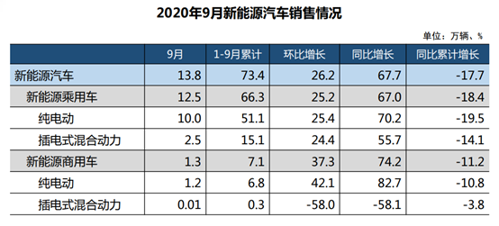 9月新能源汽車(chē)增長(zhǎng)勢(shì)頭強(qiáng)勁,新能源汽車(chē)生產(chǎn)13.6萬(wàn)輛,同比增長(zhǎng)48%;9月銷(xiāo)售新能源汽車(chē)13.8萬(wàn)輛,同比增長(zhǎng)67.7%。不過(guò)受今年以來(lái)新能源汽車(chē)下滑嚴(yán)重影響,前9月新能源汽車(chē)?yán)塾?jì)生產(chǎn)73.8萬(wàn)輛,下滑18.7%;前9月累計(jì)銷(xiāo)售73.4萬(wàn)輛,下降17.7%。