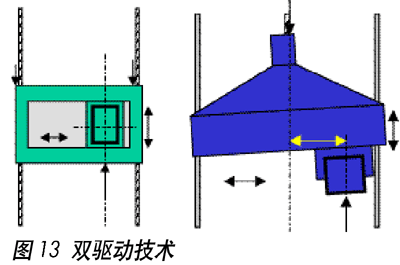 其次是采用雙驅(qū)動技術(shù)(圖13)。對于較寬工作臺或龍門架型式,如果采用中間驅(qū)動,實(shí)際無法保證驅(qū)動力在中心,容易造成傾斜,使得動態(tài)性能較差。使用雙驅(qū)動,雙光柵尺,一個(gè)驅(qū)動模塊,就能使動態(tài)性能非常完美。一個(gè)驅(qū)動指令,雙驅(qū)同時(shí)工作,光柵尺來檢測兩點(diǎn)是否平衡,如果不平衡則通過不同指令使其達(dá)到平衡。